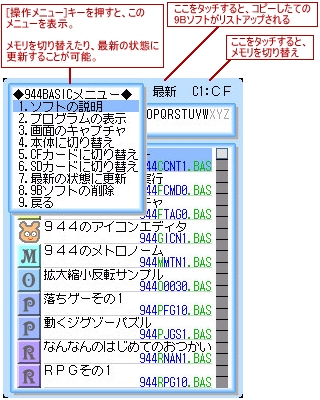 この9Bソフト専用のディレクトリは、944BASICという名前で、本体メモリ、CFカード、SDカードに作成します。9Bのインストール先カードに作成するのが一般的ですが、必要に合わせて、本体、CF、SDのどこに作成してもかまいません(本体、CF、SDのすべてに作成してもかまいません)。